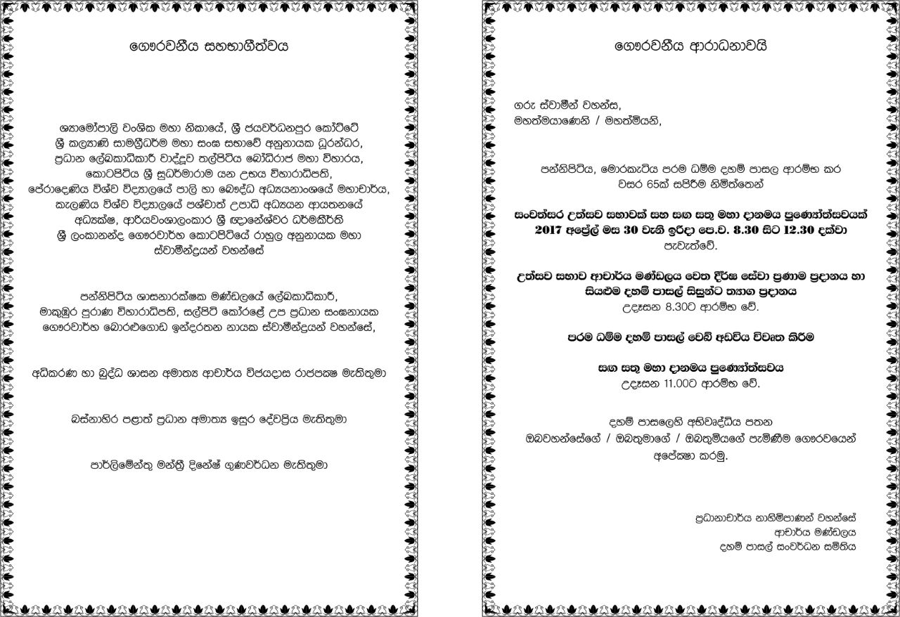 65 වන සන්වත්සරය වෙනුවෙන් කරන ලද ආරාධනා පත්‍රය